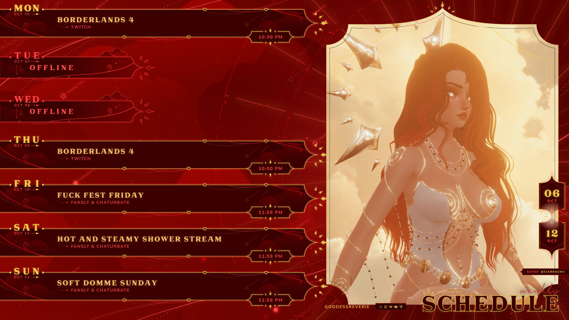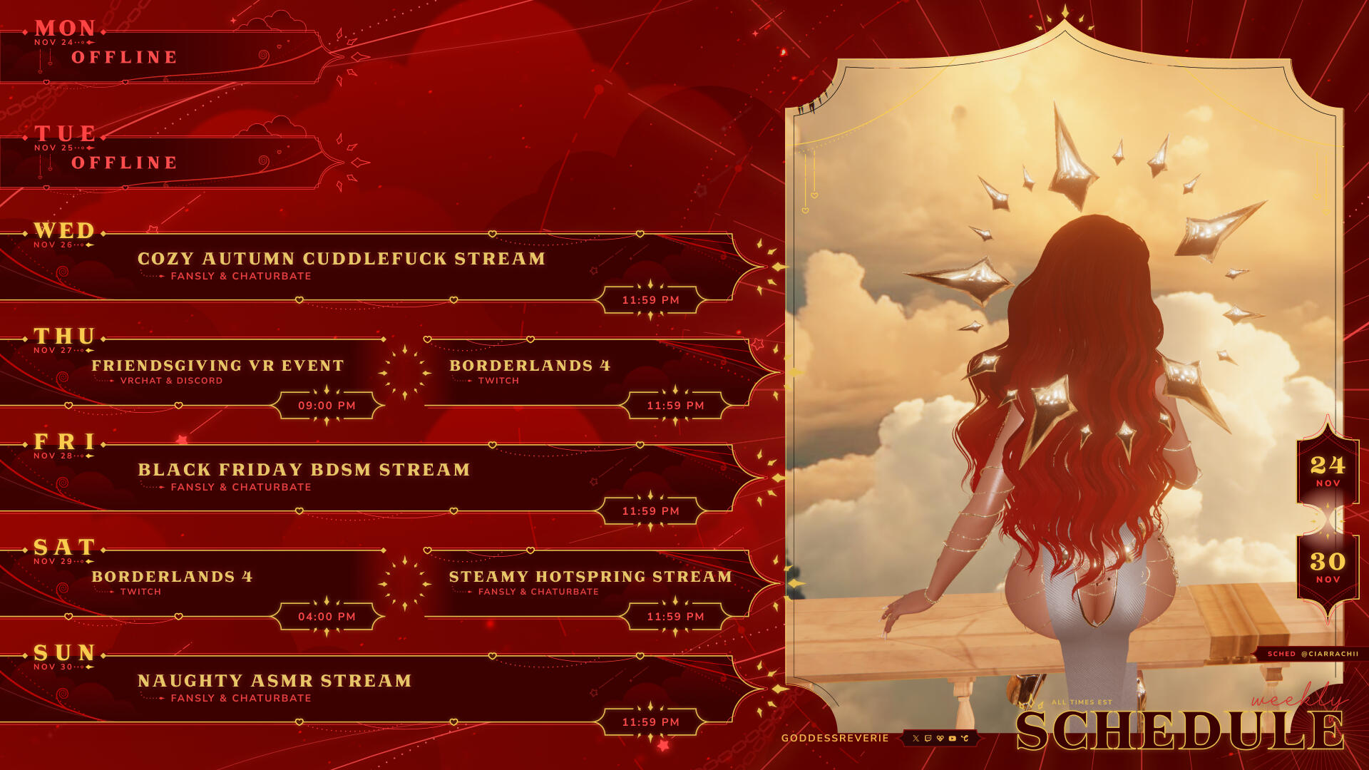 Goddess Reverie is available to make appearance as both a speaker and a featured guest—whether the topic is VTubing, NSFW content creation, the BDSM lifestyle, community building, or creative storytelling. She adds insight with warmth, humor, and a focus on genuine conversation.